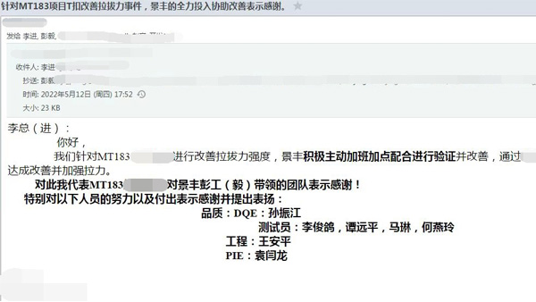 客戶導向下努力奮斗的景豐人 ——記MT183項目T扣改善拉拔力事件 景豐 鄧文強 2022年5月12日,景豐收到了一封客戶的表揚郵件,客戶感謝景豐在MT183項目的全力投入和協助改善。客戶的這一份認可,有我們不懈的努力和堅持。 積極應對,用行動踐行客戶導向 4月24日下午兩點,客戶聯系了項目四組的負責人彭毅,表示183項目制定的標準沒有達到產品預期的效果,需要與景豐共同商討解決。當天下午三點,客戶趕到景豐生產現場,要求產線停產。 收到通知后,品質部工程師... -