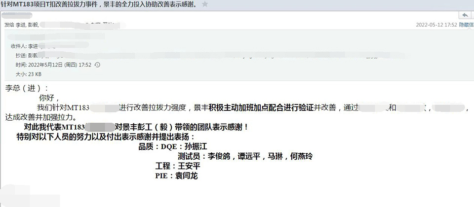 2022年5月12日,景豐收到了一封客戶的表揚郵件,客戶感謝景豐在MT183項目的全力投入和協(xié)助改善。客戶的這一份認可,有我們不懈的努力和堅持。